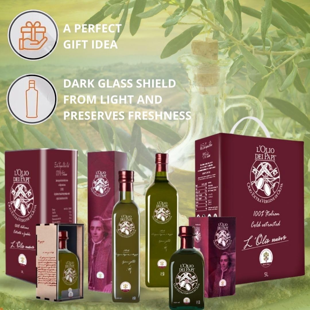 Indulge in the exquisite taste of L'Olio dei Papi, a premium extra virgin olive oil that captures the essence of Italy's finest olive groves. Crafted with meticulous attention to detail, this luxurious oil boasts a rich, fruity aroma and a velvety smooth texture that elevates any dish. Savor the robust flavors of ripe olives, complemented by subtle notes of herbs and spices, as you drizzle it over salads, pasta, or freshly baked bread. Packaged in elegant green glass bottles with a striking burgundy cap, L'Olio dei Papi adds a touch of sophistication to your kitchen. Embrace the authentic taste of Italy with every drop of this exceptional extra virgin olive oil.