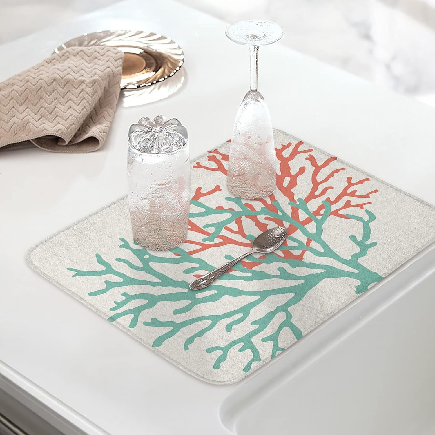 Maybe you wash most of your items in the dishwasher, but some crystal vases, glasses, and delicate items, as well as pots and pans and other items that don't fit in the dishwasher, need to be hand washed.A soft dish drying mat is a good option for handwashing.♫High Quality Drying Mat- The surface of the drying mat for kitchen counter is composed of soft microfiber material.- Dish mat with elastic sponge interlayer, high water absorption.- The bottom of the dish mats for counter is made of natural rubber, which is environmentally friendly and non-slip.♫Drying Mat For Kitchen CounterDish mat drying kitchen mat placed on the countertop quickly absorbs water splashes while washing dishes at the sink, avoid water spots from running into the cabinets.♫Drying Mat For TableDry mat for dishes can be used as placemats to isolate high-temperature food and avoid tableware from scratching the tabletop to protect the integrity of the tabletop.♫Dog Dish MatRustic dish drying pad can also be used as pet utensils pads to avoid stains from seeping into the ground after pets overturn the food while eating, reducing the time for housework.♫Mouse PadPortable dish drying mat works great with the mouse, absorbs drips from a frosty drink, cushions your arm against the hard table top, and has plenty of space left over for a notepad and pencil jar.♫Coffee Maker MatDish mat drying quickly capture coffee splatter and protect expensive kitchen countertops and other interior surfaces from coffee splatter or coffee bean stains.♫Great Gift IdeaFarmhouse dish drying mat is the best gift for family and friends because of its stylish design and strong water absorption, suitable for housewarming, birthday parties, weddings, Christmas, Thanksgiving, St. Patrick's Day, Easter Holidays, Valentine's Day, Independence Day, etc.