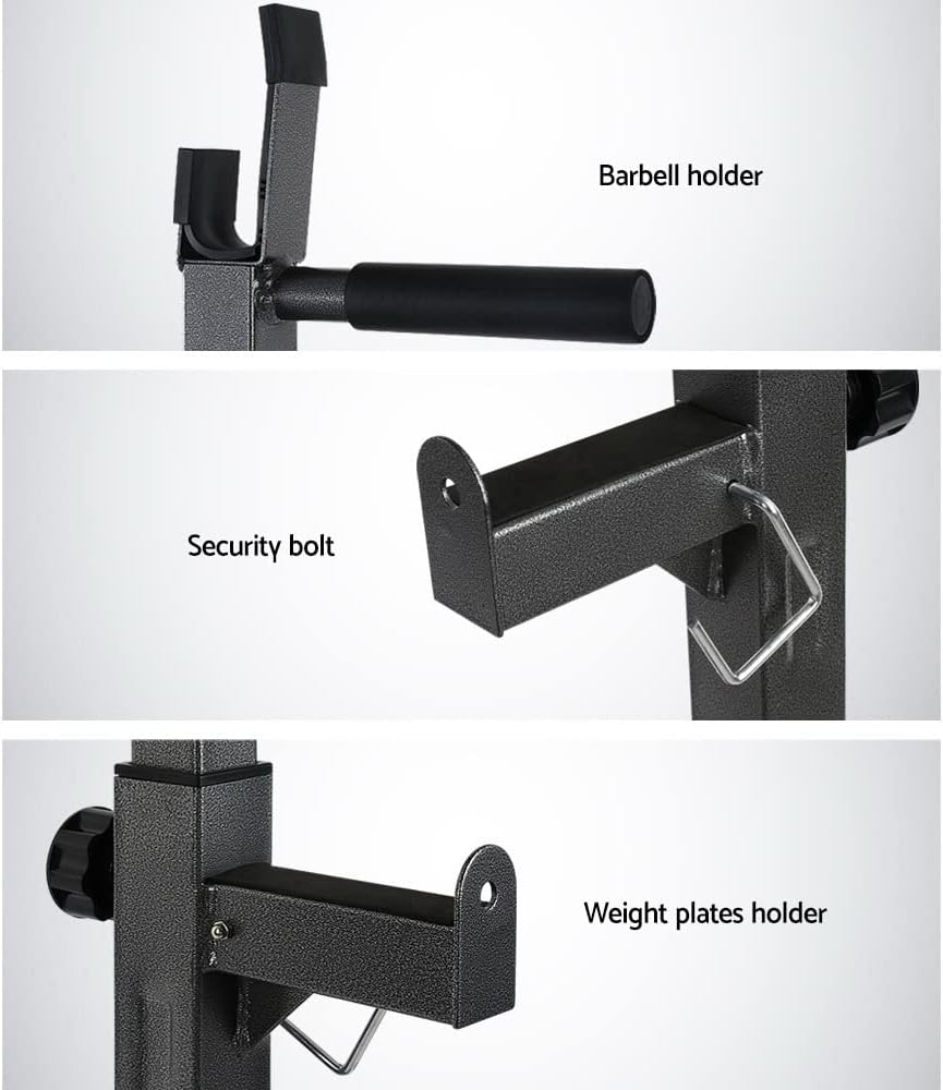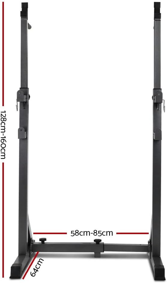The Everfit Squat Rack Set is a practical addition to your gym equipment at home. It features a pair of quality stands to hold your barbell set while you do your squats or deadlifts. Made of a strong powder-coated steel construction, the racks can hold a massive 300kg maximum weight capacity. The 10 holes allow a huge range of height adjustments between 128cm and 160cm that enables you to have a complete workout routine. Not least, the non-slip feet ensure enhanced stability and safety even with the most rigorous training regimes. Note: Barbell set is not includedFeatures Strong powder-coated steel construction Massive weight capacity 10 adjustable height settings Non-slip feet Easy to assemble Specifications: Weight capacity: 300kg Product Dimension: 58-85cm x 64cm Height range: 128cm to 160cm Package Content Squat Rack x1 User manual x11-Year Warranty:For your peace of mind, this product comes with a 1-year warranty. We value our customers and wish to make your purchase experience as enjoyable as possible. If something goes wrong with your product, please do not hesitate to contact us for assistance.