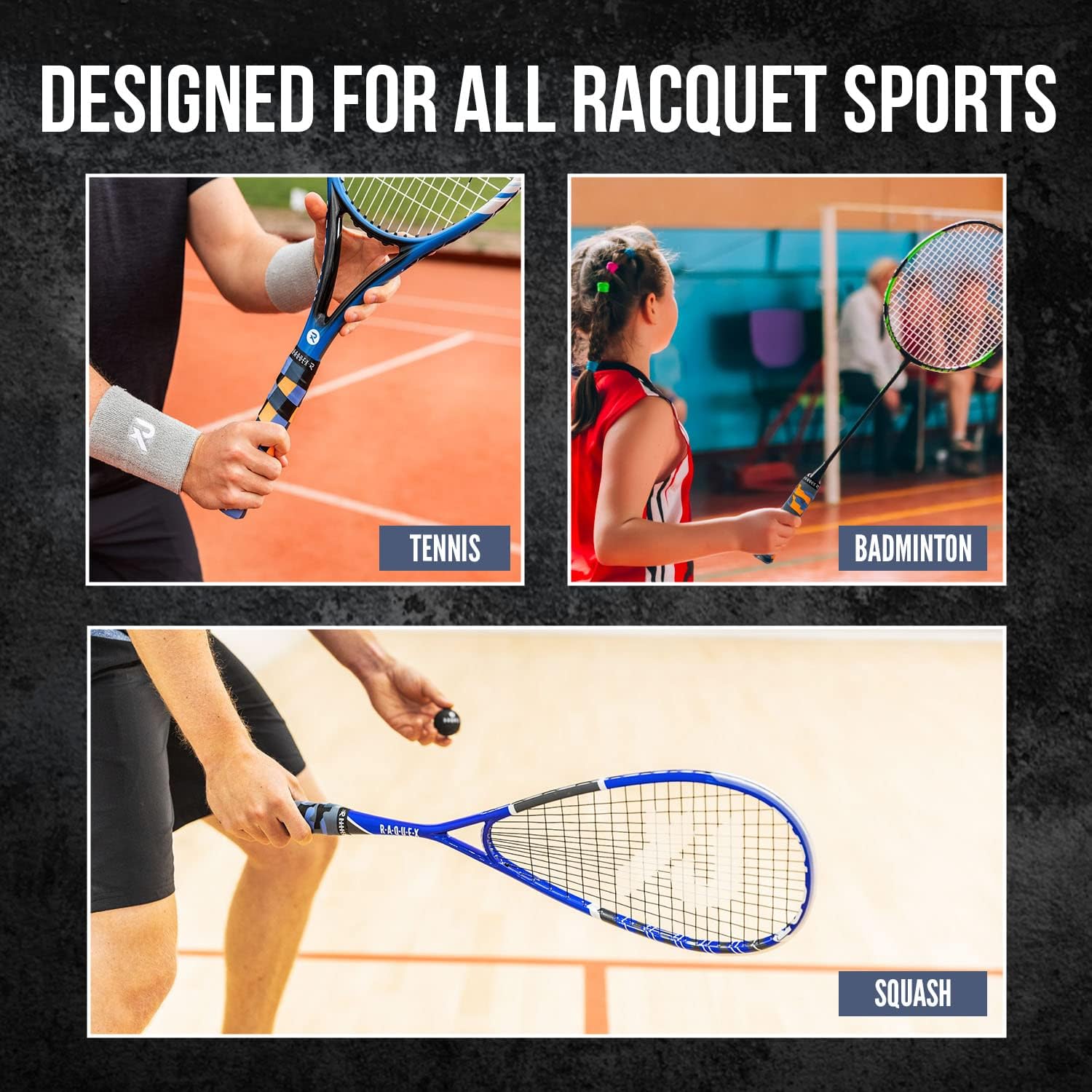 Raquex’s Evoke distinctive camouflage inspired tennis racket grip tape is the perfect choice for players who prefer a more rugged and outdoorsy look for their sports racquets, but want the grippy, reliable performance that Raquex's overgrip tapes always serve up. The racquet over grip tape anti slip pack of three consists of the camo earthy colours such as greens, browns, greys, and oranges and offer a quick and simple remedy for restoring old, worn out racket grips; the perfect badminton, squash or tennis racket overgrip tape as well as many other racket sports. Our squash, badminton and tennis racquet overgrip tape is highly absorbent and exceptionally durable. Crafted from a super-soft material, Raquex’s overgrip tape feels great on the hands, allowing for a comfortable and anti slip secure grip, providing optimal comfort and control during gameplay. The grip is pre-cut and has a handy ‘Start’ printed on the end you fit to the handle first. Each grip comes with a finishing tape to secure the top of the grip firmly in place. So, don't let your racket's grip hinder your game's performance, trust in Raquex's overgrip tape to restore and maintain full control and comfort during play! HOW TO USE Raquex Evoke Overgrip Tape is a replacement sports racquet tape that you apply over old worn grip tape. It comes in a long, 115cm length and can be cut to the required size needed. To use, simply apply the self-adhesive start end (removing the protective film) to the base of your handle and then securely wrap in a clockwise direction around the racket handle, securing it with the finishing tape supplied.